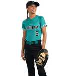 * 100% polyester wicking knit with color secure(r) technology that helps prevent dye migration * Wicks moisture * Ladies' fit * Tag-free label * Outside locker label * V-neck collar * Designed to be NFHS compliant